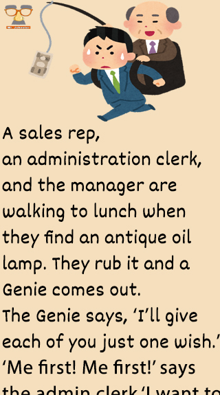 A sales rep, an administration clerk, and the manager are walking to lunch when they find an antique oil lamp.